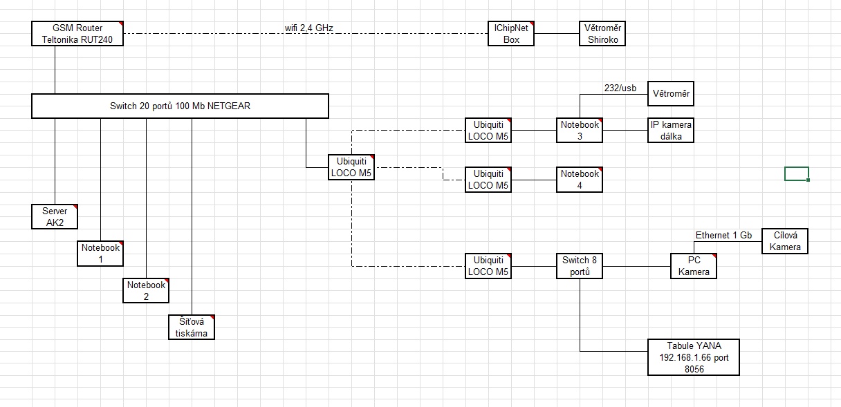 PC pro cílovou kameru má dvě síťové karty. Jednu USB Gigabitovou pro připojení samotné cílové kamery, která kvůli bezpečnosti běží na samostatné síti. Mohla by být připojena do stejné sítě jako celý stadion, ale mohlo by se stát, že problém v síti ohrozí připojení cílové kamery a tím ke ztrátě měřeného závodu. PC kamery mám připojen do stadionové sítě přes switch, do krerého je připojena tabule YANA a vše připojuje k serveru AK2 pojítko LOCO M5. Pojítko zajišťuje, že naměřené a vyhodnocené časy z cílové kamery se přenášejí do výsledkové listiny AK2 a na tabuli v cíli.